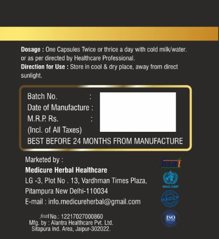 Dosage: One Capsules twice or thrice a day with cold milk/water. or as per directed by Healthcare Professional.